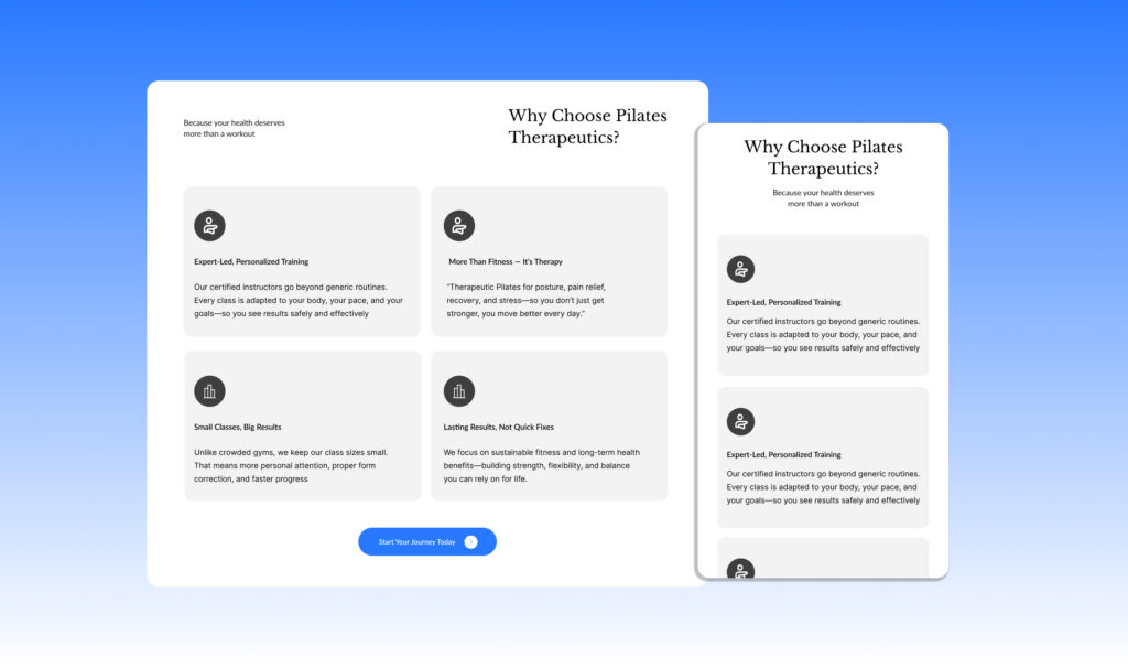 Another challenge was choosing a color palette that conveyed wellness and relaxation without feeling dull. Organizing the content hierarchy was equally important—making sure the key offerings stood out without overwhelming users. Finally, I had to focus on visual storytelling that reflected the elegance and flow of Pilates, while keeping the overall design light and uncluttered