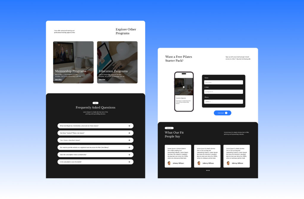 This project involved designing a modern and visually appealing landing page for a Pilates studio. The goal was to create a seamless user experience that clearly communicates the studio’s services while reflecting a sense of calm and wellness. The design emphasizes a clean layout, soft color palette, and high-quality imagery to engage visitors and convey the benefits of Pilates effectively.