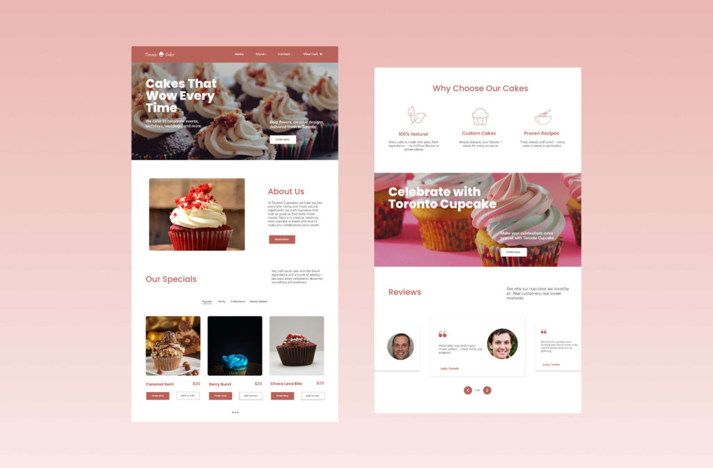 Toronto Cupcakes was created to demonstrate how a modern cupcake brand can present its treats online with a sense of warmth, delight, and simplicity. The design approach focuses on large appetizing photography that captures not just the cupcakes, but the feeling of enjoying them—helping visitors imagine the experience for themselves. A soft yet inviting color palette was chosen to reflect sweetness and comfort, while playful typography adds a layer of charm that underscores the creativity and attention to detail behind each flavor.
