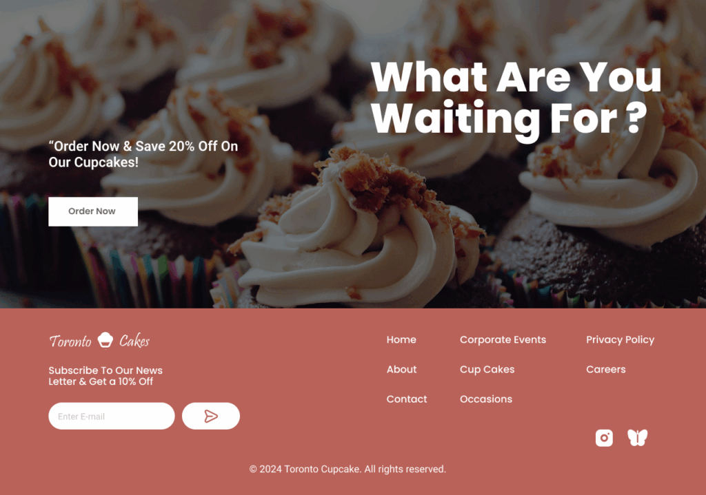 The Toronto Cupcakes Landing Page Design Concept is built to embody sweetness, charm, and timeless delight. Inspired by the principles of playfulness and elegance, the design uses large appetizing imagery, pastel tones, and playful typography to create a premium yet approachable atmosphere. Every element is thoughtfully placed to highlight the creativity and quality of the cupcakes while ensuring a seamless and enjoyable browsing experience. The concept aims to transform the way visitors connect with desserts online—making the process feel not just functional, but delightful.